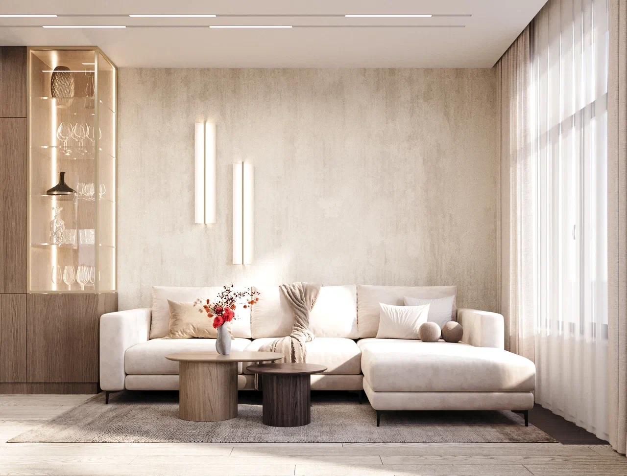 По цветовой гамме пожеланием заказчиков был современный лаконичный интерьер в светлых теплых тонах с ощущением света и воздуха, использованием шпона в отделке, а в мастер-зоне – темных серых оттенков.
